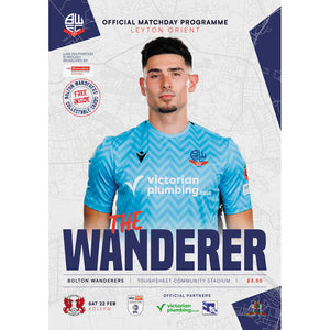 Cover of 'The Wanderer' matchday programme for Bolton Wanderers v Leyton Orient featuring a male player in a blue shirt with the team and sponsor names, along with the programme details and price.